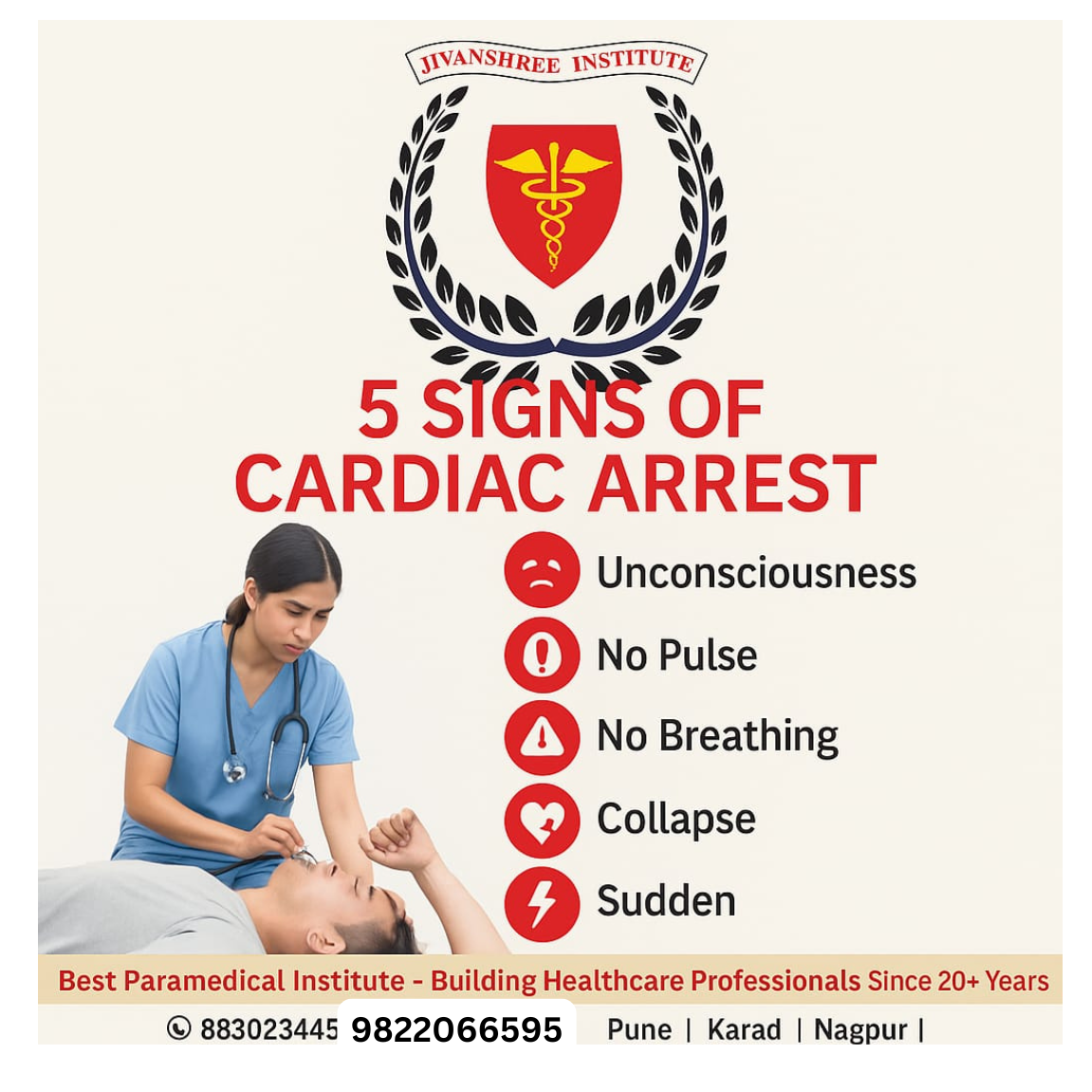 Cardiac arrest can strike suddenly and requires immediate medical attention. Recognizing the early signs can help save a life. The five major signs of cardiac arrest include unconsciousness, absence of pulse, no breathing, sudden collapse, and abrupt onset of symptoms. These warning signals indicate that the heart has stopped functioning effectively, and swift CPR or emergency response becomes crucial. At Jivanshree Institute, with over 20+ years of excellence, students are trained to identify such critical situations and respond with confidence. The institute focuses on practical, skill-based training for paramedical and healthcare careers, preparing future professionals to act effectively during emergencies. With experienced faculty, advanced training modules, and multi-city campuses including Pune, Karad, and Nagpur, Jivanshree Institute continues to build competent healthcare heroes who make a real difference in society. For admissions and inquiries: 8830234345 | 9822066959 #CardiacArrestSigns #SaveLives #CPRAwareness #JivanshreeInstitute #HealthcareEducation #ParamedicalTraining #MedicalEmergency #FirstAidTraining #20YearsExcellence #Pune #Karad #Nagpur
