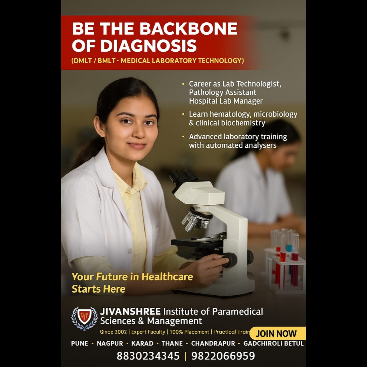 Take the first step toward a successful career in healthcare with Jivanshree Institute of Paramedical Sciences and Management. Our DMLT/BMLT (Medical Laboratory Technology) programs are designed to prepare you for a rewarding career as a Lab Technologist, Pathology Assistant, or Hospital Lab Manager. Students gain in-depth knowledge of hematology, microbiology, and clinical biochemistry, along with hands-on laboratory training using advanced automated analyzers. With government-recognized programs, expert faculty, and a strong focus on practical learning and 100% placement, Jivanshree Institute has been shaping healthcare professionals since 2002. Join us and become an essential part of medical diagnosis and patient care. 📞 Contact: 8830234345 | 9822066959 🌐 www.jivanshreeinstitutes.com 📍 Pune | Karad | Nagpur | Thane | Gadchiroli | Chandrapur | Betul #JivanshreeInstitute #MedicalLaboratoryTechnology #DMLT #BMLT #ParamedicalEducation #HealthcareCareers #SkillBasedLearning #FutureInHealthcare #LabTechnologist #HealthcareProfessionals #CareerInHealth #JivanshreeParamedical