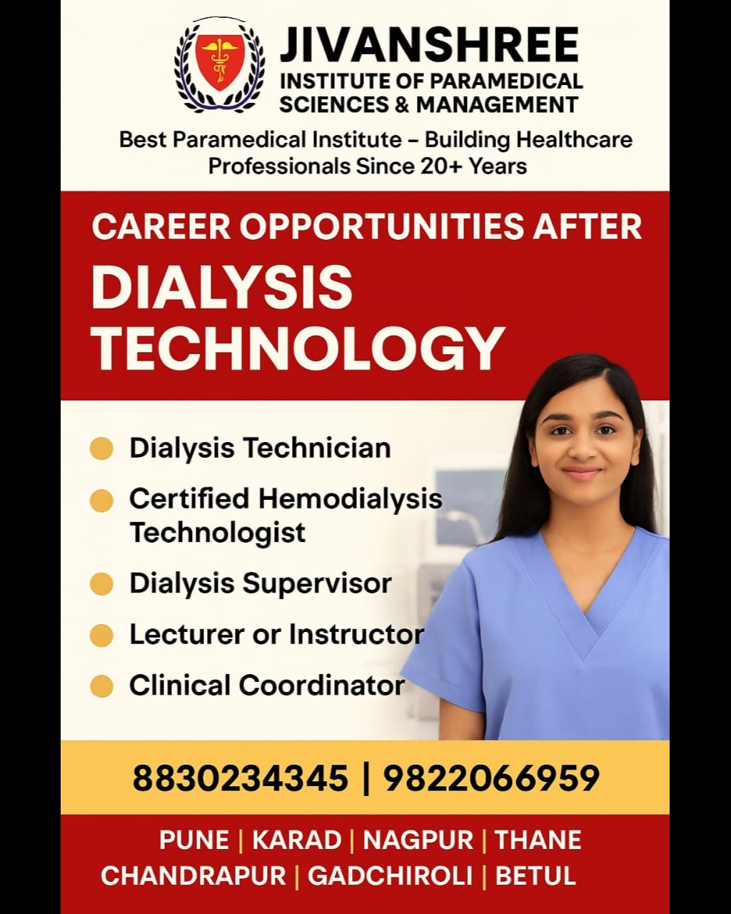 The Jivanshree Institute of Paramedical Sciences and Management, a government-recognized institution with over 20+ years of excellence, continues to empower students through industry-oriented healthcare programs. Dialysis Technology is one of the most promising fields today, offering stable career growth and the opportunity to make a life-changing impact on patients. With comprehensive programs such as Diploma, B.Sc., M.Sc., PG Diploma, MBA, and Ph.D., Jivanshree equips students with advanced clinical knowledge, hands-on training, and professional confidence. Graduates can pursue roles such as Dialysis Technician, Certified Hemodialysis Technologist, Dialysis Supervisor, Clinical Coordinator, and Lecturer/Instructor, making it an ideal pathway for a long-term healthcare career. Located across Pune, Karad, Nagpur, Thane, Gadchiroli, Chandrapur, and Betul, the institute ensures accessible, high-quality education for aspiring medical professionals. For admissions and career guidance, contact 8830234345 | 9822066959 and take your first step toward a fulfilling future in Dialysis Technology. #JivanshreeInstitute #DialysisTechnology #HealthcareCareers #ParamedicalEducation #MedicalTraining #DialysisTechnician #HealthcareProfessionals #FutureMedic #Pune #Karad #Nagpur #Thane #Gadchiroli #Chandrapur #Betul