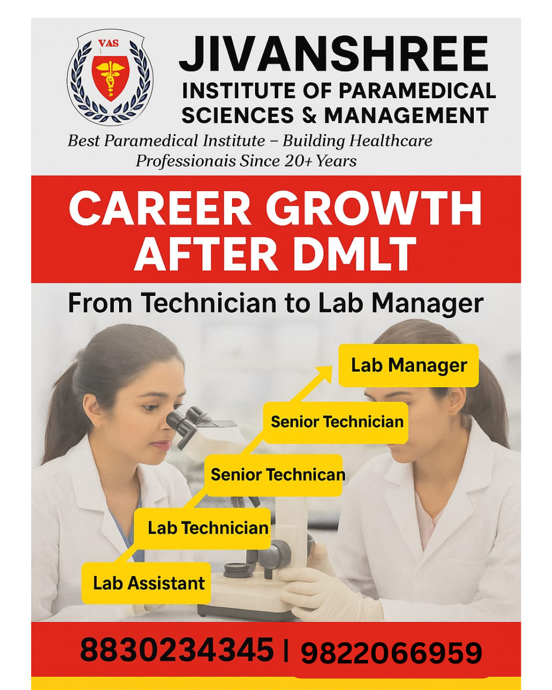 Unlock your professional potential with the Jivanshree Institute of Paramedical Sciences and Management, a government-recognized institute shaping healthcare experts for over 20 years. This image highlights the remarkable career growth opportunities after completing DMLT, starting from Lab Assistant and advancing step-by-step to Lab Technician, Senior Technician, and ultimately Lab Manager. Our expert faculty, practical-based training, and modern laboratory facilities prepare you for real-world success in hospitals, diagnostic centers, and pathology labs. With campuses in Pune, Karad, Nagpur, Thane, Chandrapur, Gadchiroli, and Betul, students receive accessible, high-quality education across Maharashtra and Madhya Pradesh. Enroll now and take the next step toward a stable and respected career in medical diagnostics. 📞 8830234345 | 9822066959 #JivanshreeInstitute #DMLTCareer #ParamedicalEducation #LabTechnician #HealthcareTraining #CareerGrowth #MedicalLabTechnology #SkillDevelopment #BestParamedicalInstitute #FutureHealthcareProfessionals