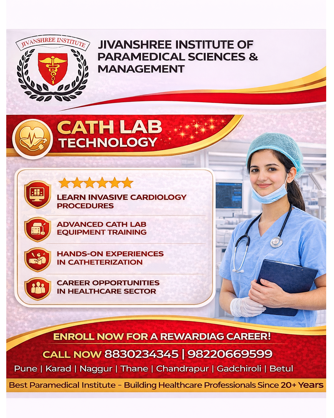 Jivanshree Institute of Paramedical Sciences and Management proudly offers advanced education in Cath Lab Technology, designed for students aspiring to build a rewarding career in the healthcare sector. As a government-recognised institute, Jivanshree provides a wide range of programs including Diploma, B.Sc., M.Sc., PG Diploma, MBA, and Ph.D., ensuring strong academic foundations and professional growth. The Cath Lab Technology program focuses on invasive cardiology procedures, advanced cath lab equipment training, and extensive hands-on experience in catheterization, preparing students for real-world clinical environments. With expert faculty, modern infrastructure, and a strong emphasis on internships and placements, students gain the confidence and skills required to excel in hospitals and cardiac care centers. Jivanshree has campuses in Pune, Karad, Nagpur, Thane, Gadchiroli, Chandrapur, and Betul, making quality paramedical education accessible across regions. 📞 Contact: 8830234345 | 9822066959 #CathLabTechnology #JivanshreeInstitute #ParamedicalEducation #CardiacCare #HealthcareCareers #GovernmentRecognised #MedicalTraining #CareerInHealthcare #ClinicalExcellence #HealthcareProfessionals