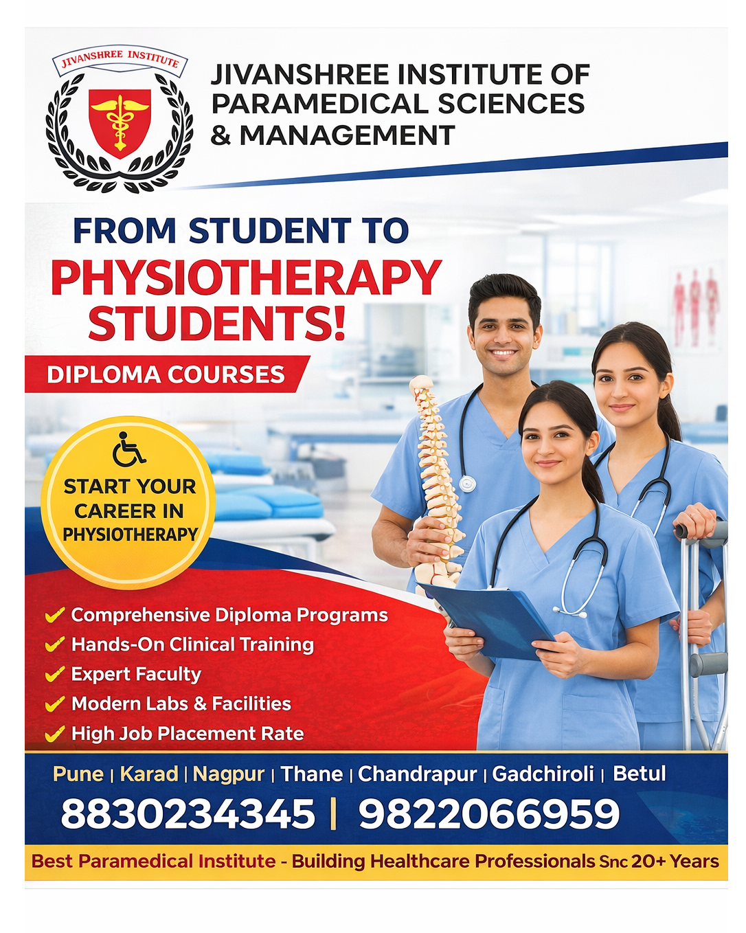 Jivanshree Institute of Paramedical Sciences and Management proudly offers comprehensive diploma programs in Physiotherapy, designed to transform students into skilled healthcare professionals. This poster reflects the institute’s commitment to quality education through hands-on clinical training, expert faculty, and modern labs and facilities. As a government-recognised institute, Jivanshree provides career-focused courses including Diploma, B.Sc., M.Sc., PG Diploma, MBA, and Ph.D., ensuring strong academic and professional growth. The physiotherapy program emphasizes practical learning, patient care experience, and a high job placement rate, enabling students to confidently enter the healthcare sector. With campuses across Pune, Karad, Nagpur, Thane, Gadchiroli, Chandrapur, and Betul, Jivanshree makes quality paramedical education accessible across regions. Backed by more than 20 years of excellence, the institute continues to build capable healthcare professionals. For admissions and enquiries, contact 8830234345 or 9822066959. #PhysiotherapyCareer #JivanshreeInstitute #ParamedicalEducation #HealthcareProfessionals #DiplomaInPhysiotherapy #GovtRecognisedInstitute #HandsOnTraining #HealthcareJobs #MedicalStudents #BuildYourFuture