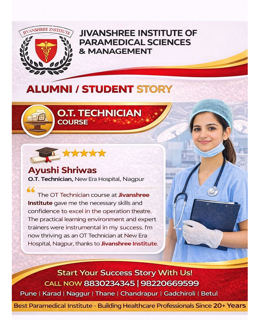 Jivanshree Institute of Paramedical Sciences and Management takes pride in shaping successful healthcare professionals through quality education and practical training. This inspiring alumni story reflects our commitment to excellence. With government-recognised programs ranging from Diploma, B.Sc., M.Sc., PG Diploma, MBA to Ph.D., Jivanshree empowers students to build confident and rewarding careers in the paramedical field. Our institute focuses on hands-on clinical exposure, expert faculty guidance, and modern facilities that prepare students for real-world healthcare environments. With campuses across Pune, Karad, Nagpur, Thane, Gadchiroli, Chandrapur, and Betul, we ensure accessible education and strong placement support. At Jivanshree, every student’s journey matters. From classroom learning to hospital practice, we nurture skills, confidence, and professionalism. Begin your own success story with us and step into a future dedicated to care, service, and growth. 📞 Contact us: 8830234345 | 9822066959 #JivanshreeInstitute #ParamedicalEducation #AlumniStory #OTTechnician #HealthcareCareers #StudentSuccess #MedicalTraining #GovernmentRecognised #FutureInHealthcare #BuildYourCareer