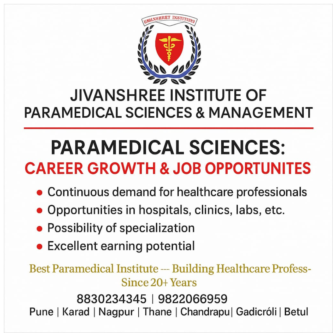 Looking for a career that’s both stable and fulfilling? The paramedical field offers endless opportunities for growth, specialization, and success! At Jivanshree Institute of Paramedical Sciences & Management, we prepare you to meet the rising demand for skilled healthcare professionals. Here’s why a career in Paramedical Sciences is the right choice: ✅ Continuous demand in hospitals, labs, and clinics ✅ Opportunity to specialize in your area of interest ✅ Excellent earning potential and career advancement ✅ A chance to serve and impact lives every day Join us today and build a successful future in healthcare! 📞 8830234345 | 9822066959 📍 Pune | Karad | Nagpur | Thane | Chandrapur | Gadchiroli | Betul #JivanshreeInstitute #ParamedicalCareer #HealthcareEducation #CareerInHealthcare #DMLT #OTT #XRayTechnician #ParamedicalCourses #HealthcareProfessionals #AlliedHealth #MedicalTraining #AdmissionsOpen #StudyParamedical