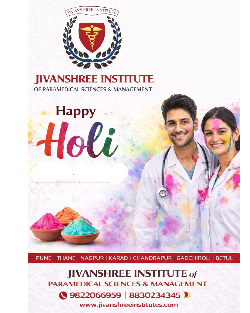 Happy Holi” written in colorful typography with vibrant powder splash effects. 👩⚕️👨⚕️ Visual Theme: Two smiling medical professionals wearing white lab coats and stethoscopes, celebrating Holi with colored powder on their faces and clothes — symbolizing healthcare with festive spirit. 🎨 Festive Elements: Bowls of bright Holi colors (gulal) placed at the bottom left. 📍 Branch Locations: Pune | Thane | Nagpur | Karad | Chandrapur | Gadchiroli | Betul 📞 Contact Numbers: 9822066959 | 8830234345 🌐 Website: www.jivanshreeinstitutes.com