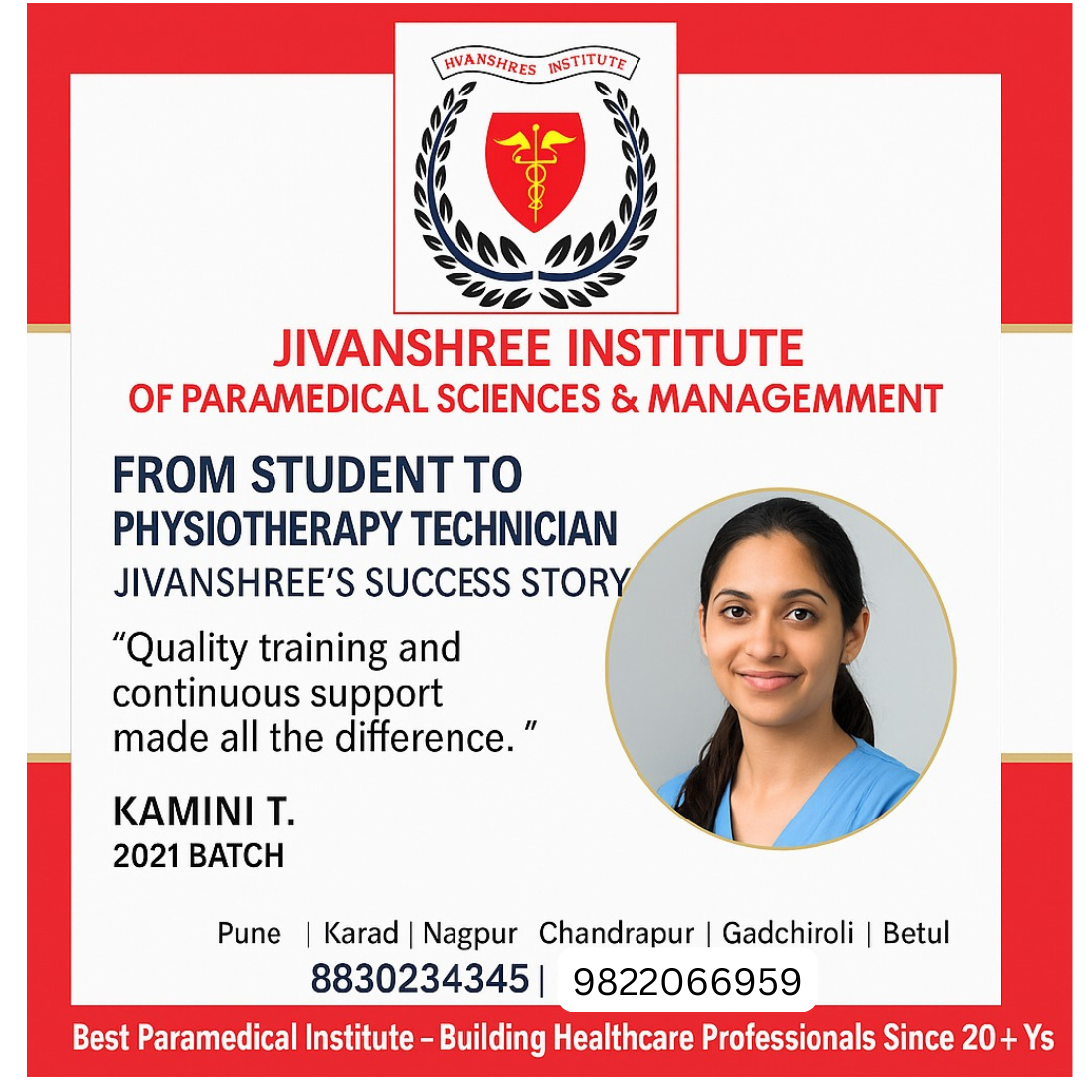 Jivanshree Institute of Paramedical Sciences and Management proudly continues its mission of shaping future healthcare leaders through high-quality, government-recognized education. With campuses across Pune, Karad, Nagpur, Thane, Gadchiroli, Chandrapur, and Betul, the institute offers a wide range of programs including Diploma, B.Sc., M.Sc., PG Diploma, MBA, and Ph.D. courses. This image highlights the inspiring journey of a Physiotherapy Technician student, reflecting the institute’s strong focus on practical learning, expert guidance, and continuous support. At Jivanshree, students receive comprehensive hands-on training that builds confidence and prepares them for real-world clinical roles. The institute’s 20+ years of experience in paramedical education ensures every student gains the skills and professional edge needed to excel in today’s healthcare industry. For admissions and counseling, contact 8830234345 / 9822066959 and begin your journey toward a successful medical career with Jivanshree Institute. #JivanshreeInstitute #ParamedicalEducation #PhysiotherapyTechnician #HealthcareTraining #MedicalCareer #GovernmentRecognizedCourses #ParamedicalInstitute #HealthcareProfessionals #SkillBasedLearning #PhysiotherapyAssistant #CareerInHealthcare #Pune #Karad #Nagpur #Thane #Gadchiroli #Chandrapur #Betul