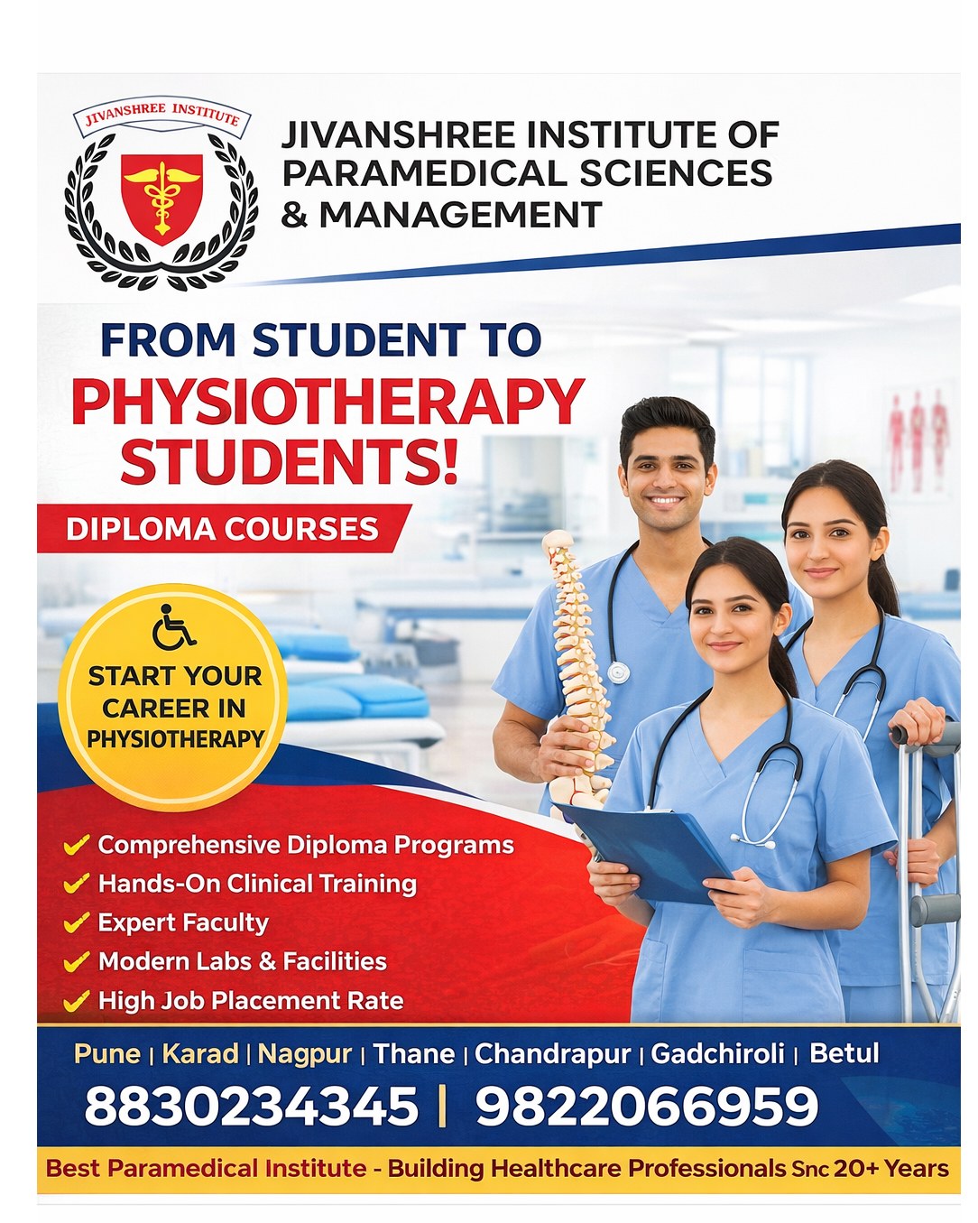 Jivanshree Institute of Paramedical Sciences and Management is a government-recognized institute dedicated to shaping skilled healthcare professionals for a brighter future. With over 20 years of excellence in paramedical education, the institute offers a wide range of career-oriented programs including Diploma, B.Sc., M.Sc., PG Diploma, MBA, and Ph.D. courses. Our physiotherapy and paramedical programs are designed with a strong focus on hands-on clinical training, expert faculty guidance, and modern laboratories to ensure students gain real-world skills. Jivanshree Institute has campuses across Pune, Karad, Nagpur, Thane, Gadchiroli, Chandrapur, and Betul, making quality education accessible to students from multiple regions. We emphasize holistic learning, strong placement support, and industry-relevant training to help students confidently transition from classroom to career. Admissions are now open. For more information, contact 8830234345 or 9822066959 and begin your journey in healthcare today. #JivanshreeInstitute #ParamedicalSciences #PhysiotherapyCareer #HealthcareEducation #GovtRecognised #ParamedicalCourses #MedicalEducation #AlliedHealth #AdmissionsOpen #BuildYourFuture