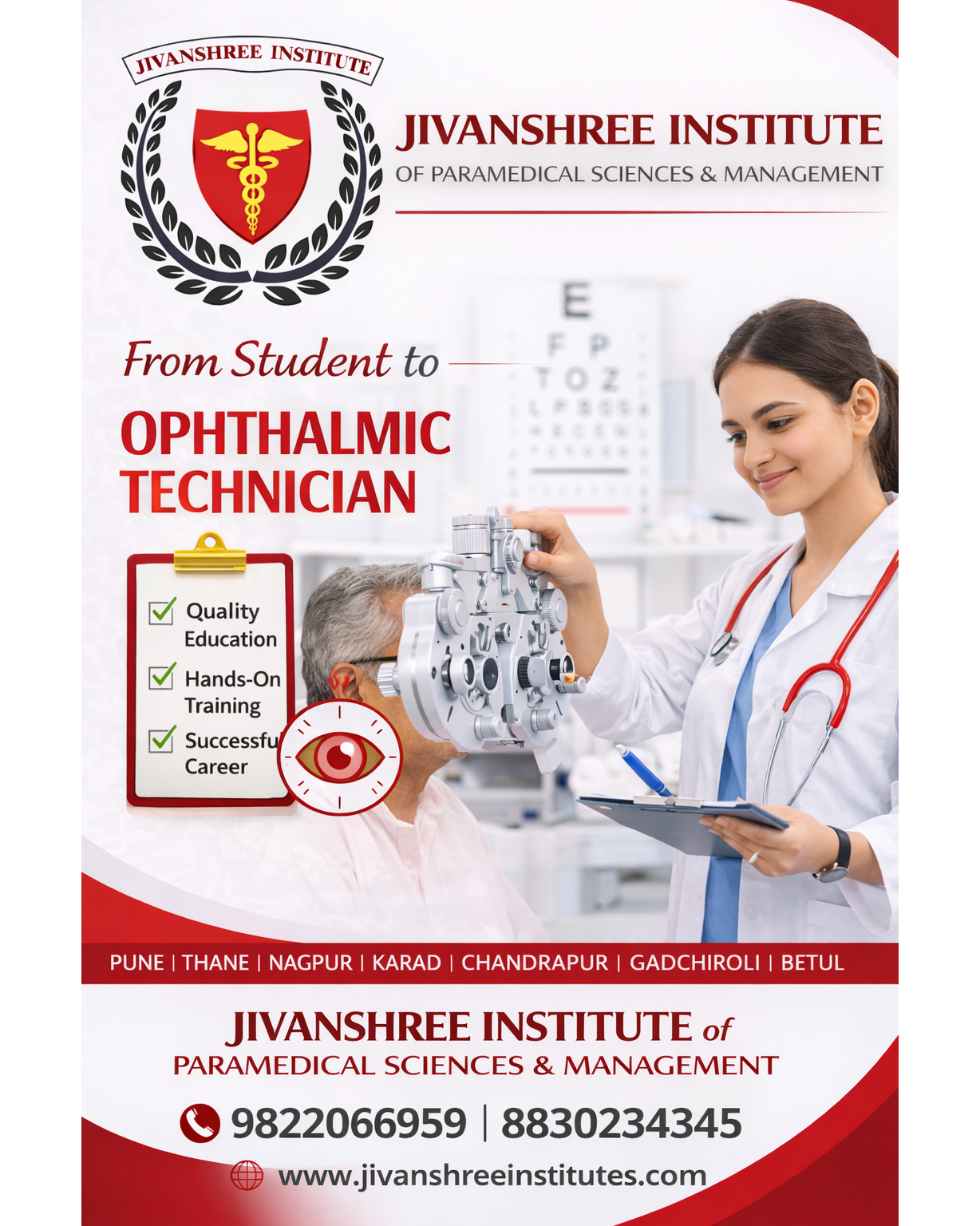 Jivanshree Institute of Paramedical Sciences and Management provides excellent opportunities for students who aspire to build a rewarding career as an Ophthalmic Technician. The institute focuses on transforming students into skilled healthcare professionals through quality education, hands-on training, and career-oriented programs. Students learn advanced techniques in eye testing, vision care, diagnostic procedures, and patient management under expert guidance. As a government recognized institute, Jivanshree offers a wide range of professional programs including Diploma, B.Sc., M.Sc., PG Diploma, MBA, and Ph.D. designed to meet the growing demand for trained healthcare professionals. With experienced faculty, modern laboratories, and practical clinical exposure, students gain the knowledge and confidence needed to work in hospitals, eye clinics, and diagnostic centers. The institute operates across multiple locations including Pune, Karad, Nagpur, Thane, Chandrapur, Gadchiroli, and Betul, making quality paramedical education accessible to aspiring students. For admissions and inquiries, contact 8830234345 or 9822066959. #JivanshreeInstitute #OphthalmicTechnician #EyeCareCareer #ParamedicalEducation #HealthcareTraining #MedicalEducation #GovernmentRecognized #AlliedHealth #FutureHealthcareProfessionals #HealthcareCareer