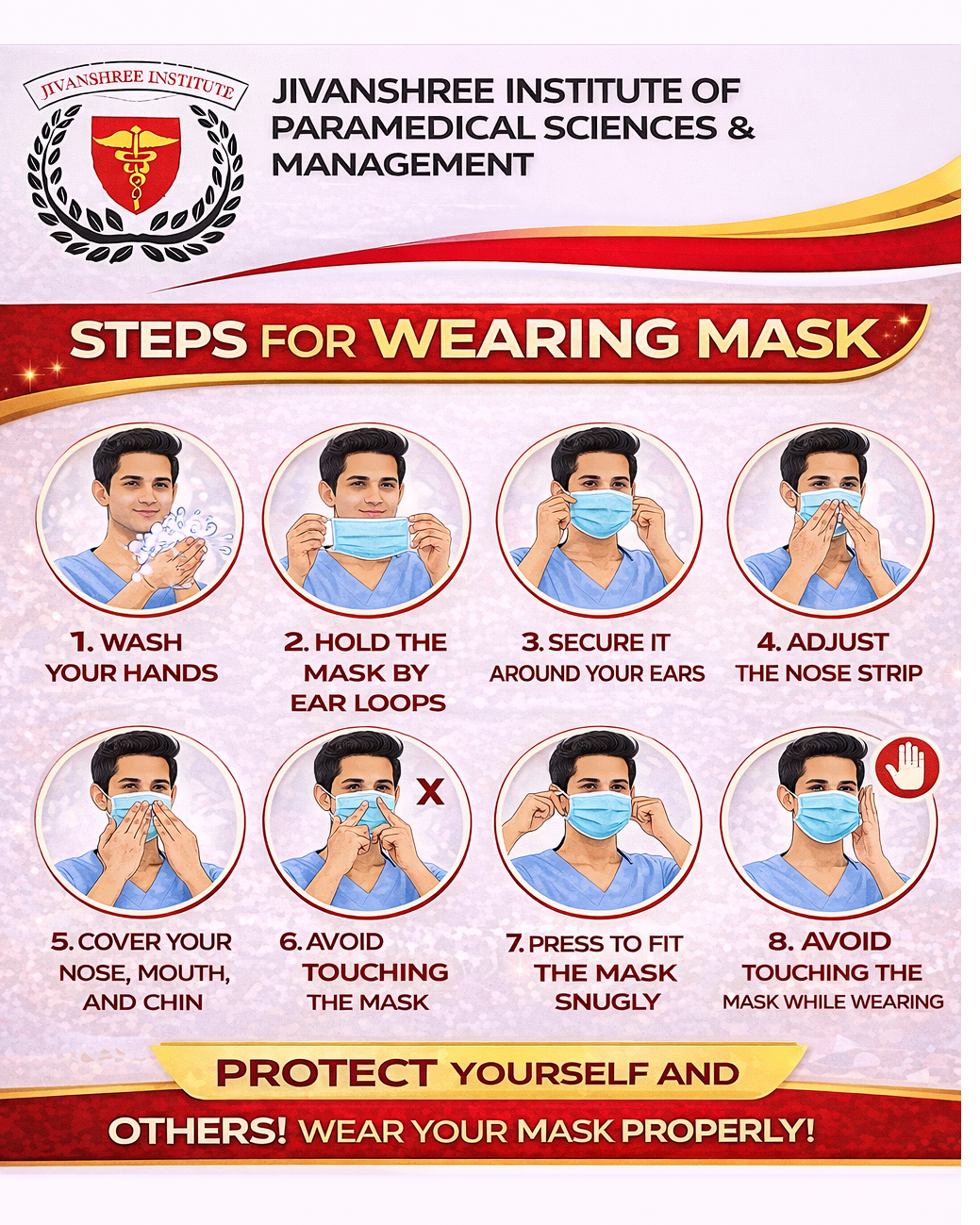 Jivanshree Institute of Paramedical Sciences and Management emphasizes the importance of personal hygiene and preventive healthcare through proper mask usage. Wearing a mask correctly is a simple yet powerful step in protecting yourself and others from infections. This visual guide highlights essential steps such as washing hands, securing the mask properly around the ears, covering the nose, mouth, and chin, and avoiding unnecessary contact with the mask while wearing it. As a government-recognized institute, Jivanshree not only provides quality education but also promotes public health awareness. The institute offers a wide range of programs including Diploma, B.Sc., M.Sc., PG Diploma, MBA, and Ph.D., nurturing responsible healthcare professionals. With campuses across Pune, Karad, Nagpur, Thane, Gadchiroli, Chandrapur, and Betul, Jivanshree is committed to building a healthier society through education and awareness. For admissions and inquiries, contact 8830234345 or 9822066959. #WearMaskProperly #HealthAwareness #JivanshreeInstitute #PreventInfection #ParamedicalEducation #PublicHealth #HealthcareSafety #StayProtected #GovernmentRecognized #HealthyIndia
