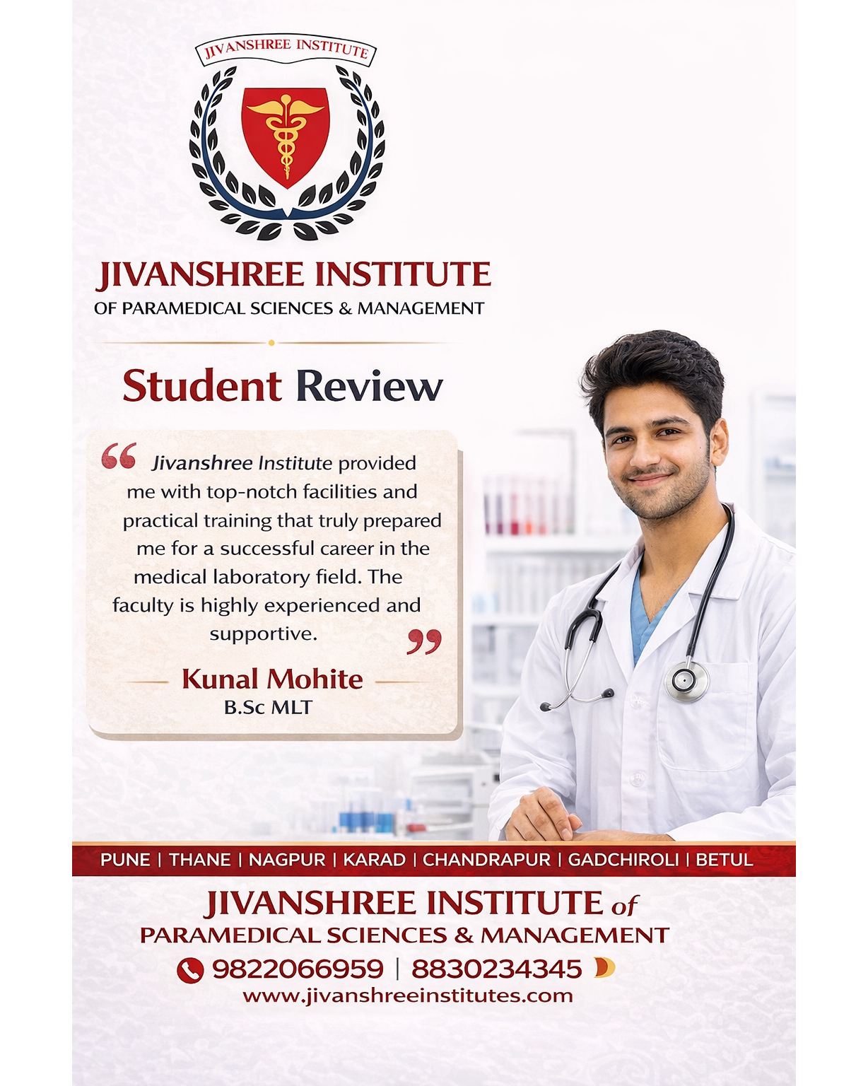 Jivanshree Institute of Paramedical Sciences and Management is committed to delivering excellence in healthcare education through quality infrastructure, practical exposure, and experienced faculty guidance. As shared by Kunal Mohite, B.Sc. MLT student, the institute provides top-notch facilities and hands-on training that prepare students for successful careers in the medical laboratory field. Being a government recognized institution, Jivanshree Institute offers a wide range of programs including Diploma, B.Sc., M.Sc., PG Diploma, MBA, and Ph.D. across its campuses in Pune, Karad, Nagpur, Thane, Gadchiroli, Chandrapur, and Betul. The curriculum is designed to combine theoretical knowledge with real-world clinical practice, ensuring students develop strong technical and professional skills. With supportive faculty and career-focused training, the institute helps students confidently step into the healthcare industry. For admissions and inquiries, contact 8830234345 or 9822066959 and begin your journey toward a rewarding career in paramedical sciences. #JivanshreeInstitute #StudentReview #BScMLT #ParamedicalSciences #HealthcareEducation #MedicalLaboratory #DiplomaCourses #MSc #PGDiploma #MBA #PhD #GovernmentRecognized #CareerInHealthcare