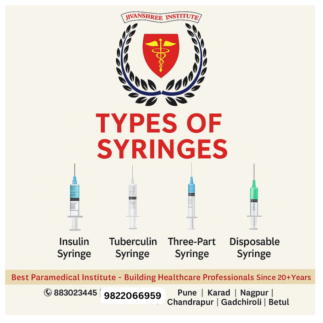 At Jivanshree Institute of Paramedical Sciences and Management, we believe that strong fundamentals create confident healthcare professionals. This visual highlights essential Types of Syringes—Insulin, Tuberculin, Three-Part, and Disposable—each crucial in clinical procedures and patient care. As a government-recognized institute, Jivanshree provides comprehensive training through Diploma, B.Sc., M.Sc., PG Diploma, MBA, and Ph.D. programs, ensuring students master both theoretical knowledge and hands-on skills. With state-of-the-art labs and expert faculty, our students learn proper syringe selection, dosage accuracy, safety protocols, and clinical applications—skills that form the backbone of quality healthcare delivery. With campuses across Pune, Karad, Nagpur, Thane, Gadchiroli, Chandrapur, and Betul, Jivanshree continues to shape competent paramedical professionals dedicated to saving lives and improving community health. For admissions and inquiries, connect with us at 8830234345 | 9822066959. #JivanshreeInstitute #ParamedicalEducation #HealthcareTraining #DMLT #MedicalSkills #SyringeTypes #FutureHealthcareProfessionals #ClinicalTraining #BestParamedicalInstitute