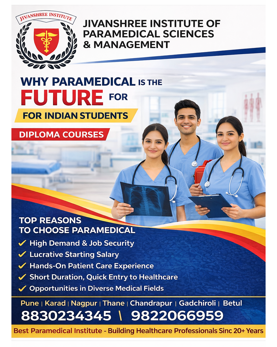 Jivanshree Institute of Paramedical Sciences and Management is shaping the future of healthcare by empowering Indian students with industry-ready paramedical education. This poster highlights why paramedical courses are a smart and secure career choice, offering high demand, job stability, and hands-on patient care experience. As a government-recognised institute, Jivanshree provides a wide range of programs including Diploma, B.Sc., M.Sc., PG Diploma, MBA, and Ph.D., designed to meet evolving healthcare needs. With short-duration courses and quick entry into the medical field, students gain practical skills, attractive starting salaries, and diverse career opportunities. Jivanshree has a strong presence across Pune, Karad, Nagpur, Thane, Gadchiroli, Chandrapur, and Betul, making quality paramedical education accessible across regions. With over 20 years of excellence, the institute remains committed to building skilled healthcare professionals for the nation. For admissions and guidance, contact 8830234345 or 9822066959. #ParamedicalIsFuture #JivanshreeInstitute #HealthcareCareers #ParamedicalCourses #GovtRecognisedInstitute #MedicalEducation #HealthcareProfessionals #DiplomaCourses #JobOrientedCourses #BuildYourCareer