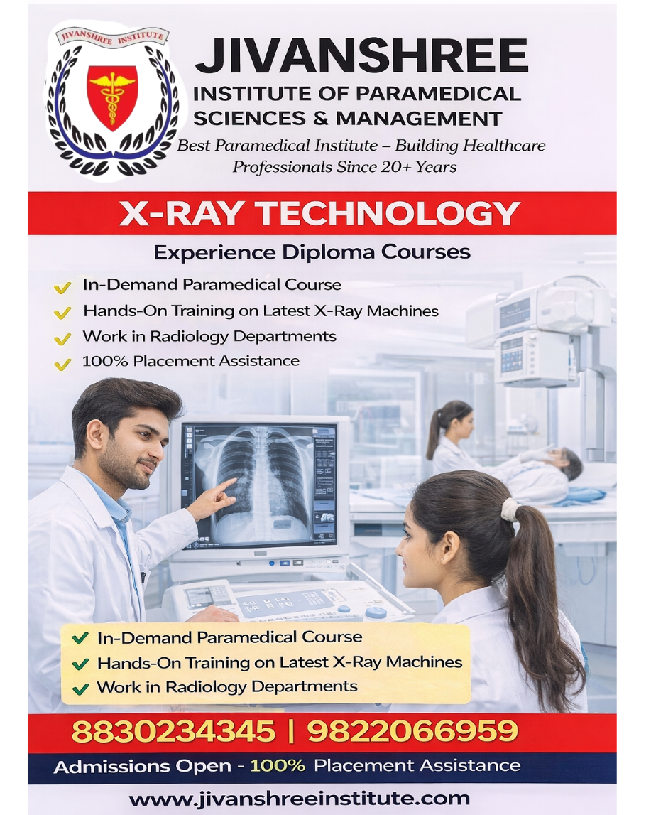 Jivanshree Institute of Paramedical Sciences and Management offers an industry-oriented Diploma in X-Ray Technology designed to prepare students for high-demand roles in medical imaging and radiology departments. This poster highlights the institute’s focus on hands-on training using the latest X-ray machines, ensuring students gain real-world technical skills and clinical exposure. As a government-recognised institute with over 20 years of excellence, Jivanshree provides a strong academic foundation through Diploma, B.Sc., M.Sc., PG Diploma, MBA, and Ph.D. programs. The X-Ray Technology course emphasizes practical learning, patient safety, and professional competence, along with 100% placement assistance. With campuses located in Pune, Karad, Nagpur, Thane, Gadchiroli, Chandrapur, and Betul, quality paramedical education is accessible across regions. For admissions and guidance, contact 8830234345 or 9822066959. #XRayTechnology #RadiologyCareers #JivanshreeInstitute #ParamedicalCourses #MedicalImaging #DiplomaInXRay #GovtRecognisedInstitute #HealthcareEducation #HandsOnTraining #HealthcareJobs