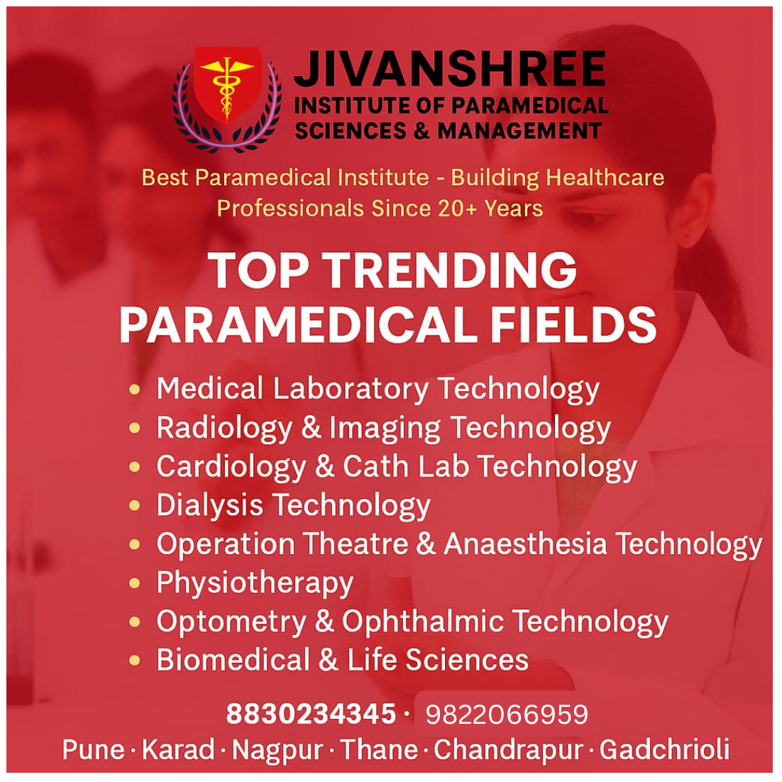 At Jivanshree Institute of Paramedical Sciences and Management, we are committed to shaping the future of healthcare by offering top-demand paramedical programs that prepare students for successful and impactful careers. With 20+ years of expertise and government recognition, the institute provides industry-oriented training through advanced laboratories, experienced faculty, and real clinical exposure. Whether your interest lies in Medical Laboratory Technology, Radiology & Imaging, Cardiology & Cath Lab, Dialysis Technology, Operation Theatre & Anaesthesia, Physiotherapy, Optometry, Ophthalmic Technology, or Biomedical & Life Sciences, Jivanshree ensures skill-focused education that meets today’s healthcare standards. Located across Pune, Karad, Nagpur, Thane, Gadchiroli, Chandrapur, and Betul, the institute offers accessible, high-quality programs including Diploma, B.Sc., M.Sc., PG Diploma, MBA, and Ph.D. For admissions or inquiries: 8830234345 | 9822066959 #JivanshreeInstitute #ParamedicalCourses #HealthcareEducation #TopTrendingFields #MedicalLaboratoryTechnology #Radiology #Cardiology #DialysisTechnology #OperationTheatreTechnology #Physiotherapy #Optometry #BiomedicalScience #ParamedicalInstitute #HealthcareCareers #AdmissionsOpen