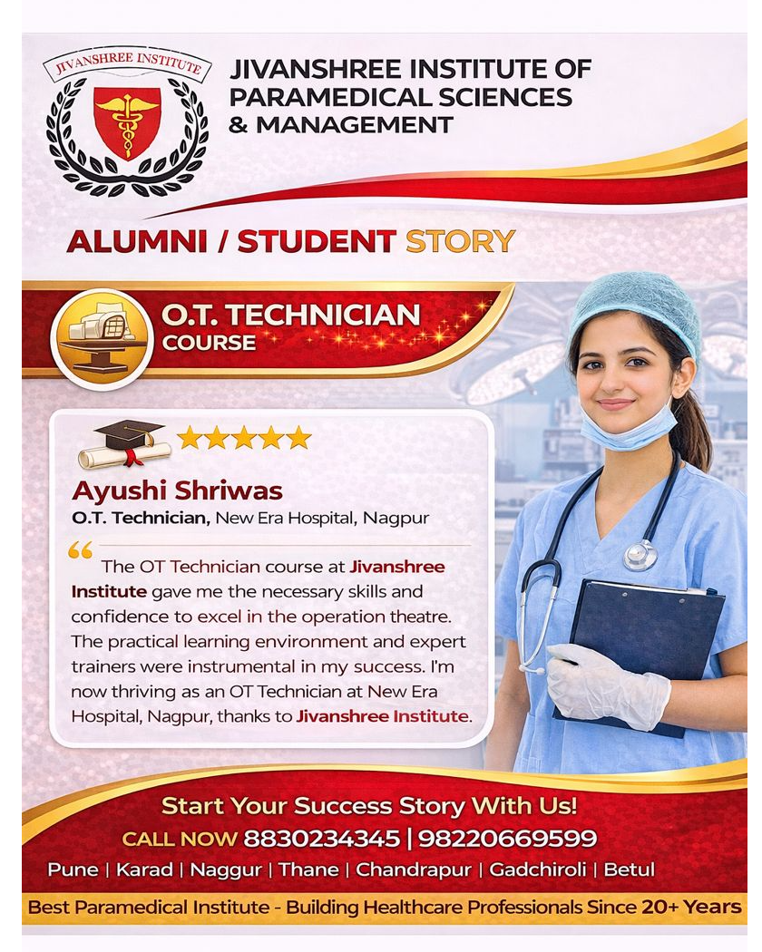 Jivanshree Institute of Paramedical Sciences and Management proudly shares inspiring alumni achievements through our Alumni/Student Story series. This image highlights Ayushi Shriwas, an accomplished O.T Technician currently working at New Era Hospital, Nagpur. Her journey reflects the quality education, practical exposure, and expert guidance provided by our institute. At Jivanshree Institute, students receive hands-on training that builds confidence and prepares them to excel in operation theatre environments. We offer government-recognized programs including Diploma, B.Sc., M.Sc., PG Diploma, MBA, and Ph.D. designed to create skilled healthcare professionals. With campuses across Pune, Karad, Nagpur, Thane, Gadchiroli, Chandrapur, and Betul, we are committed to shaping bright medical careers. Start your own success story with us today! 📞 Contact Now: 8830234345 | 9822066959 #AlumniStory #OTTechnicianCourse #JivanshreeInstitute #ParamedicalSciences #HealthcareProfessionals #GovernmentRecognizedCourses #MedicalEducation #PlacementSupport #Nagpur #SuccessStory