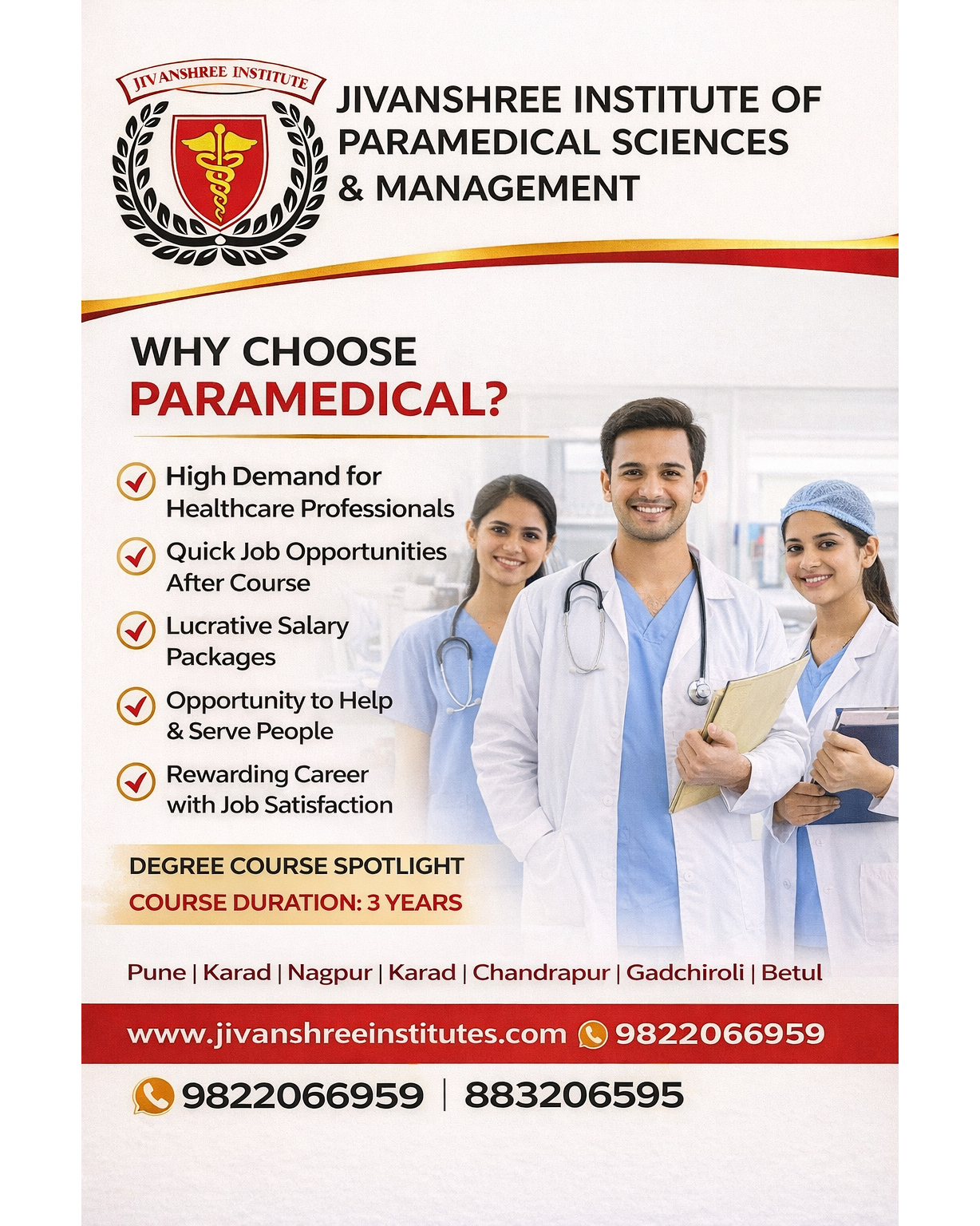 Choosing a career in paramedical sciences opens doors to a stable, rewarding, and impactful future. At Jivanshree Institute of Paramedical Sciences and Management, we empower students with the skills and knowledge required to thrive in the healthcare industry. With a high demand for healthcare professionals, paramedical courses offer quick job opportunities, attractive salary packages, and the chance to make a meaningful difference in people’s lives. As a government recognized institute, Jivanshree offers a wide range of programs including Diploma, B.Sc., M.Sc., PG Diploma, MBA, and Ph.D., designed to ensure both academic excellence and practical expertise. Our campuses across Pune, Karad, Nagpur, Thane, Chandrapur, Gadchiroli, and Betul make quality education accessible to all. Start your journey towards a fulfilling healthcare career with hands-on training and expert guidance. For admissions, contact 8830234345 or 9822066959 today. #ParamedicalCareer #HealthcareJobs #JivanshreeInstitute #MedicalEducation #CareerOpportunities #FutureHealthcare #GovernmentRecognized #AlliedHealth #CareerGrowth #HealthcareProfessionals
