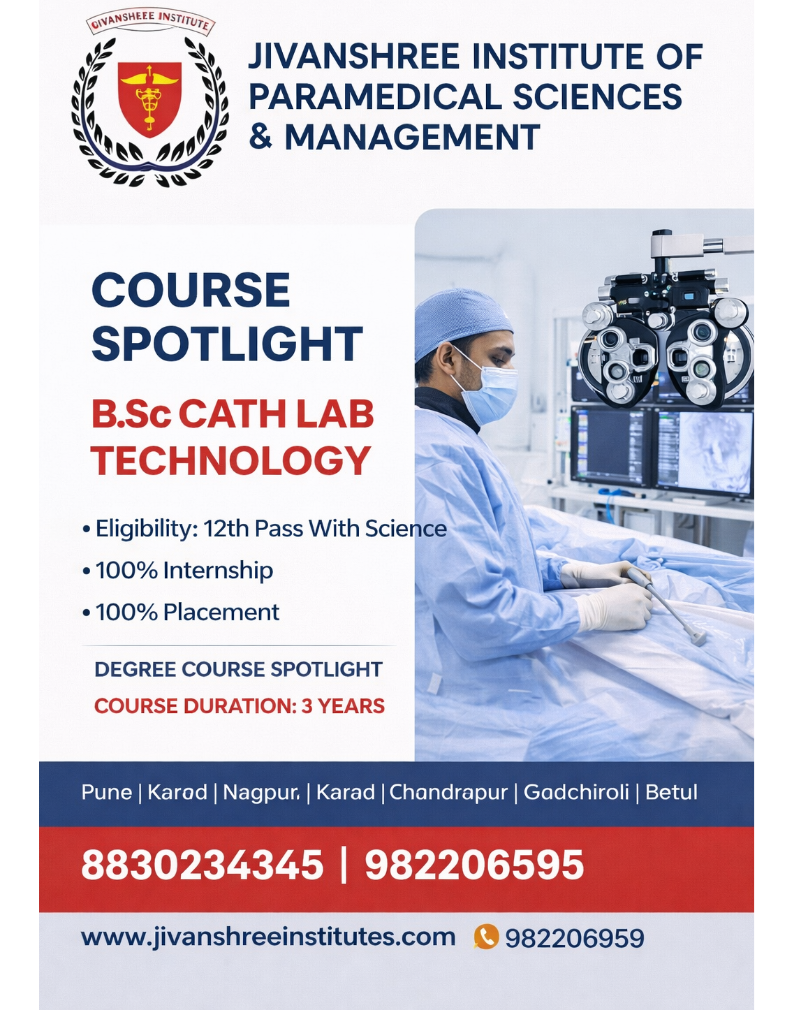 Jivanshree Institute of Paramedical Sciences and Management proudly presents the B.Sc Cath Lab Technology program, designed to build skilled professionals for advanced cardiac care. This image highlights the real-world clinical environment where students gain hands-on experience with modern catheterization lab equipment under expert supervision. The institute offers government-recognized courses including Diploma, B.Sc., M.Sc., PG Diploma, MBA, and Ph.D., focusing on practical learning, strong clinical exposure, and career readiness. The B.Sc Cath Lab Technology course has a 3-year duration, eligibility of 12th pass with Science, and ensures 100% internship and 100% placement support, helping students confidently step into the healthcare industry. With multiple campuses in Pune, Karad, Nagpur, Thane, Gadchiroli, Chandrapur, and Betul, Jivanshree Institute continues to shape future healthcare professionals through quality education and industry-focused training. 📞 Contact: 8830234345 | 9822066959 #BScCathLabTechnology #CourseSpotlight #JivanshreeInstitute #ParamedicalEducation #HealthcareCareers #GovernmentRecognized #MedicalTraining #ClinicalExcellence #AdmissionsOpen